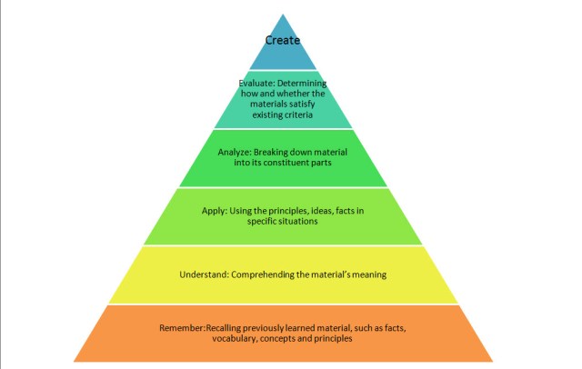 Another pedagogical element present in games is Bloom’s Taxonmy. In an effort to hierarchically order cognitive processes, Benjamin Bloom developed the Taxonomy of Cognitive Outcomes. Bloom’s cognitive taxonomy is based on the idea that cognitive activity can be ordered into six levels, each increasingly complex. In order to progress to a level, the student must have mastered the preceding level. The graphic below illustrates this process.